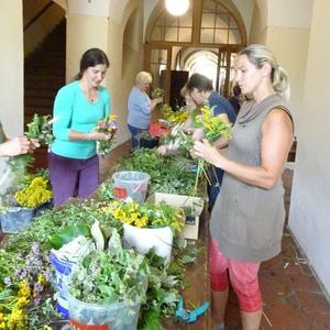 Kräuterbüschelbinden im Klostergang am 14. August 2018