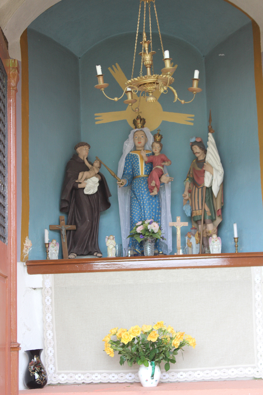 Über der Türe ist ein Christusmonogramm mit der aufgeteilten Jahreszahl 1893 davor und danach. Dies könnte die Jahreszahl der Errichtung sein. Darüber ist eine Lüftungsöffnung. Im Inneren in der Wölbung ist der Altartisch. Auf diesem befindet sich die Statuen der Muttergottes mit dem Kind mit Kronen auf den Köpfen, links der Heilige Antonius und rechts der Heilige Florian, auf den Seitenwänden ein Schutzengelbild und eine Mutter Gottes mit Kind.