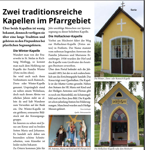 Bei der Kapelle findet jährlich eine Feldersegnung statt. Wanderer machen hier Halt um einen Blick in die Kapelle zu werfen.